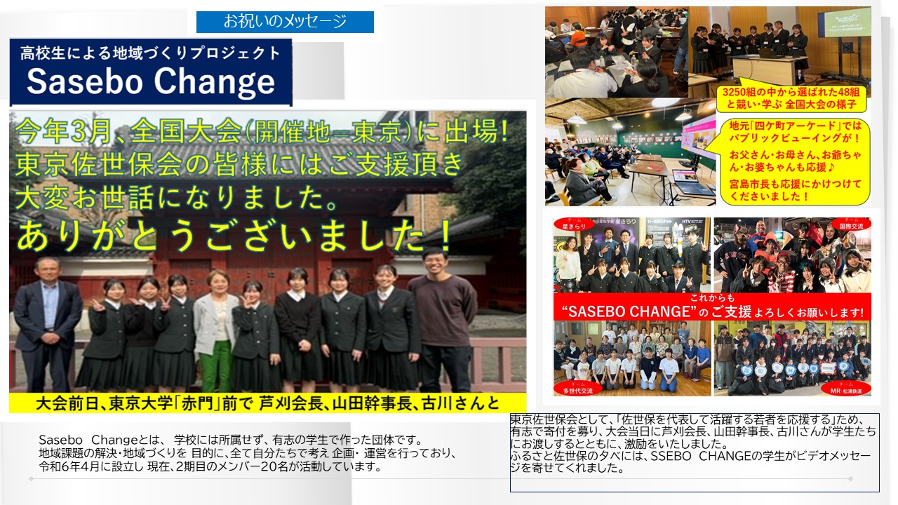 令和7年11月5日(水)、大手町サンケイプラザにおいて、宮島佐世保市長をはじめ、佐世保市ゆかりの皆様をお迎えしてみなさまと楽しい時間を過ごしました。今後も親交を深め、新たな出会いを創る場としてまた引き続きふるさと佐世保の発展に寄与できるように活動してまいります。